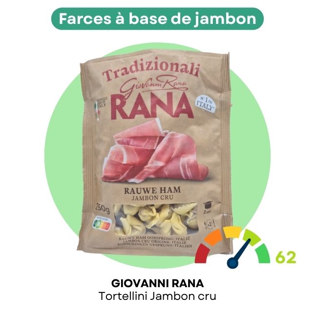 Dans la catégorie “jambon” (sous-segment de viande), seuls les Tortellini Jambon Cru de la marque Giovanni Rana sont un “bon choix”. Avec leur Nutri-Score C et l’absence d’additif dans leur composition, ces tortellinis obtiennent un score de 62/100. Notons tout de même la présence de 3 IUT (ingrédients ultra-transformés): le lactosérum en poudre, la fibre de maïs et des arômes naturels.