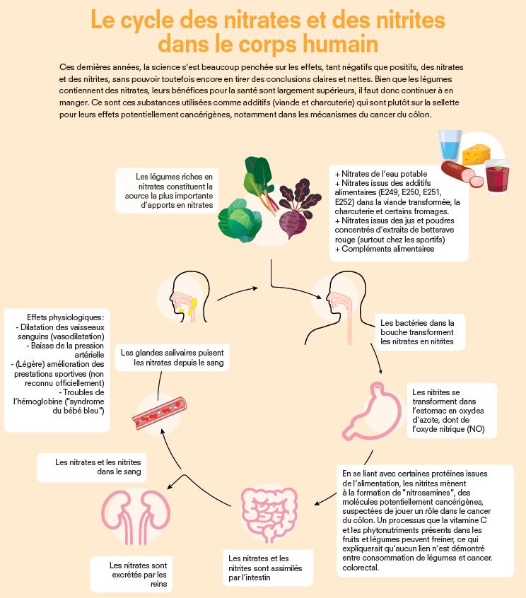 Nitrites et nitrates ont la même mère : l’azote (N). Ces deux composés chimiques, faux jumeaux, adorent se faire passer l’un pour l’autre et jouer les trouble-fête dans l’assiette du consommateur. Ils s’invitent dans notre organisme via l’alimentation (certains légumes, l’eau du robinet, les conservateurs et additifs, etc.), où ils passent, entre autres, dans la salive et le sang. Certains de leurs effets sont tantôt nocifs (risque de cancer du côlon), tantôt stimulants (d’où un certain intérêt du monde sportif).