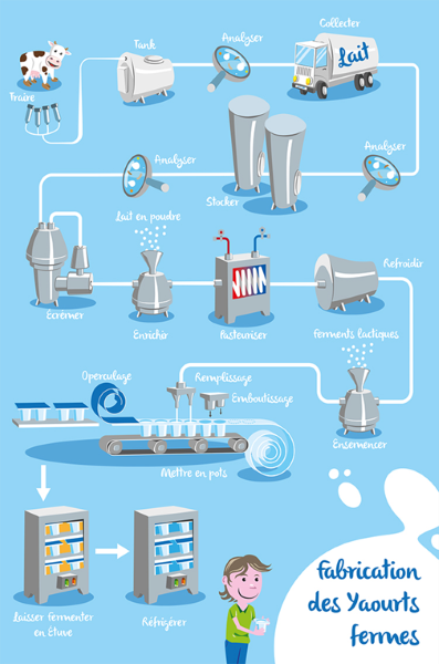 Le yaourt est, à la base, du lait pasteurisé, c’est-à-dire chauffé pour en détruire les micro-organismes indésirables, puis refroidi rapidement. À ce lait, on ajoute des ferments lactiques. Ces ferments lactiques vont transformer une partie du lactose en acide lactique. Cette acidification va figer le lait, qui prend une structure de gel. En se solidifiant, le lait devient un yaourt.