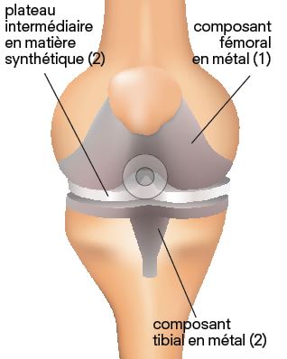 - le composant tibial en métal, avec un plateau intermédiaire en matière synthétique qui permet aux parties métalliques de se déplacer en souplesse l'une vis-à-vis de l'autre (2)