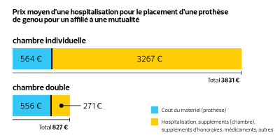 Le prix de la pose d’une prothèse du genou peut être assez élevé. Si vous n’êtes pas affilié à une mutuelle, vous payerez environ 8.000€ pour une chambre double. Le prix varie énormément en fonction de la chambre choisie. Si vous souhaitez une chambre individuelle, vous payerez en moyenne 4 à 5 fois plus que dans une chambre double (3.831€ versus 827€), surtout à cause des suppléments élevés pour la chambre et les honoraires. C’est pourquoi il est important de vous informer au préalable du prix de l’intervention, de la somme que vous devrez payer vous-même et de l’intervention éventuelle de l’assurance hospitalisation. Certains hôpitaux donnent sur leur site web une estimation du prix d’une telle intervention. Si ce n’est pas le cas, le patient a le droit de demander une estimation des coûts à l’hôpital et de demander au médecin quels suppléments il facture.