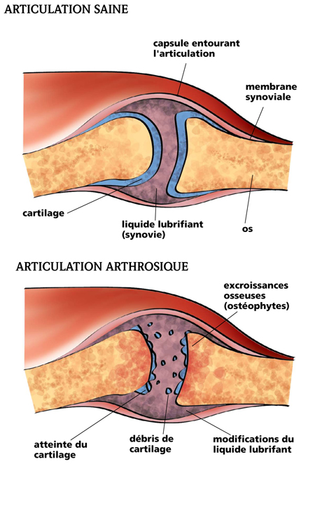 Grâce à sa structure, une articulation en bon état peut se mouvoir en souplesse et bien absorber les chocs. C’est en partie dû au fait que les extrémités des os sont recouvertes d’une couche de cartilage lisse, et grâce à la production d’un liquide synovial. En cas d’arthrose, c’est ce cartilage qui est affecté: il se détruit lentement et devient de plus en plus mince, ce qui entraîne un rapprochement des os. Des morceaux de cartilage peuvent également se détacher et se retrouver dans l’articulation, l’os lui-même peut être touché, la qualité du liquide synovial peut régresser, etc.