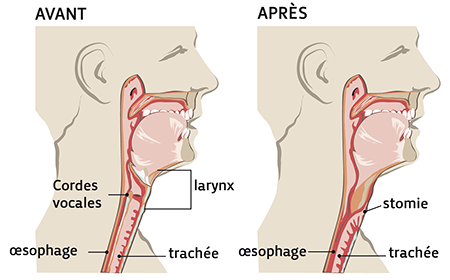 En cas de laryngectomie partielle, seul le morceau présentant la tumeur est retiré du larynx (qui renferme également les cordes vocales). Cette méthode permet souvent d’épargner la voix. En cas de laryngectomie totale, le larynx est entièrement retiré. La trachée est alors directement reliée à la trachéotomie, un petit trou situé au bas de la gorge. C’est désormais par ce petit orifice que le patient respirera. S’il a un rhume ou une bronchite, il toussera également par ce petit trou (en expectorant éventuellement du mucus ou du sang). Il doit en outre réapprendre à se moucher et à sentir.