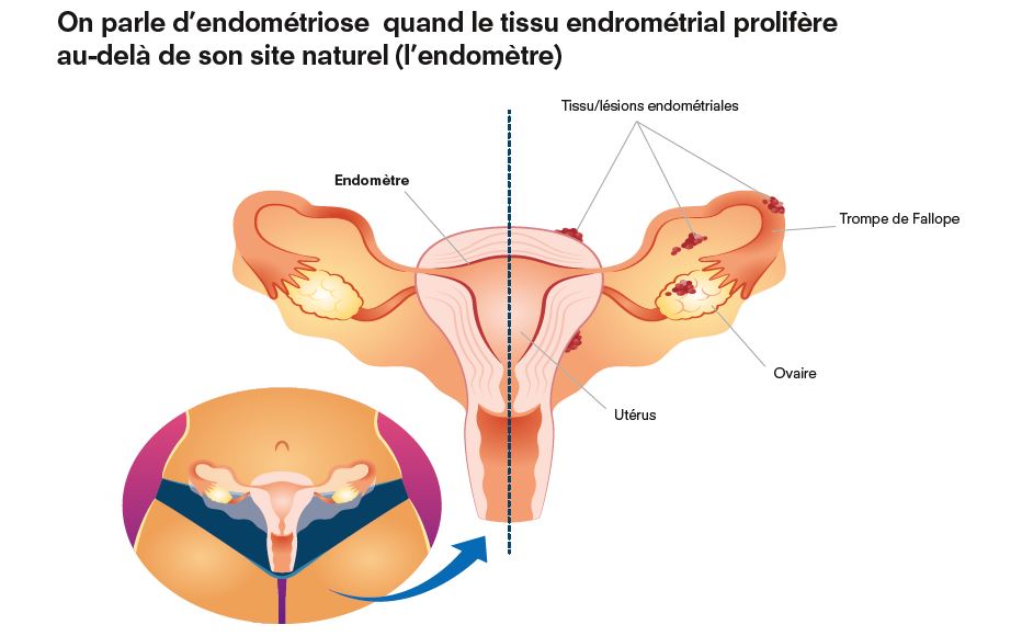 L’endométriose est une maladie inflammatoire, hormonodépendante, mais dont l’évolution n’est pas maligne. Elle tire son nom du tissu des parois internes de l’utérus, l’endomètre. Elle provoque une prolifération des cellules endométriales au-delà de leur site naturel, vers les ovaires (67 % des cas), les trompes de Fallope, le côlon (le sigmoïde, juste avant le rectum), l’appendice et la vessie, voire dans toute la cavité abdominale, et parfois jusqu’aux organes digestifs supérieurs.