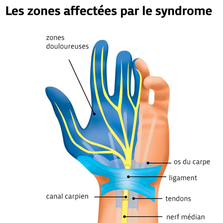 Le syndrome est provoqué par la compression de ce nerf, qui se ramifie dans la main (en jaune). Il se traduit par des fourmillements voire des douleurs, principalement dans le pouce, l’index et le majeur (zone bleue). Le nerf n’est donc pas bouché, mais écrasé.