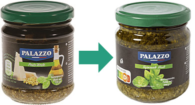 Si l’étiquette du Pesto Verde Palazzo représentait les ingrédients traditionnels du pesto, ils étaient pourtant absents de sa recette. Sous la pression de Testachats, la marque a supprimé l’image des ingrédients qu’il ne contient pas et l’appelle désormais Palazzo Tapenade Verde.