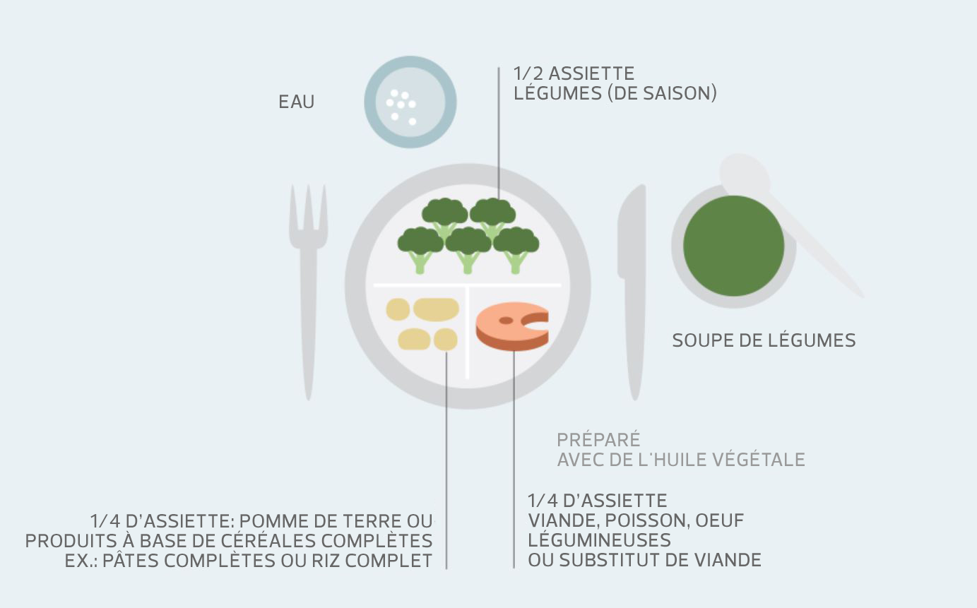 Votre petit déjeuner doit toujours contenir 4 aliments: un produit laitier, un fruit, des céréales (complètes) et un café, un thé ou de l’eau. Un lunch comprend toujours des céréales (complètes), des matières grasses avec modération, une garniture (de préférence végétale) et une portion de légumes. Un repas chaud équilibré se composera quant à lui de légumes pour moitié, d’un quart de pommes de terre ou d’un produit à base de céréales et d’un quart de viande, de poisson, d’œufs, de légumineuses ou d’un produit de substitution végétal.