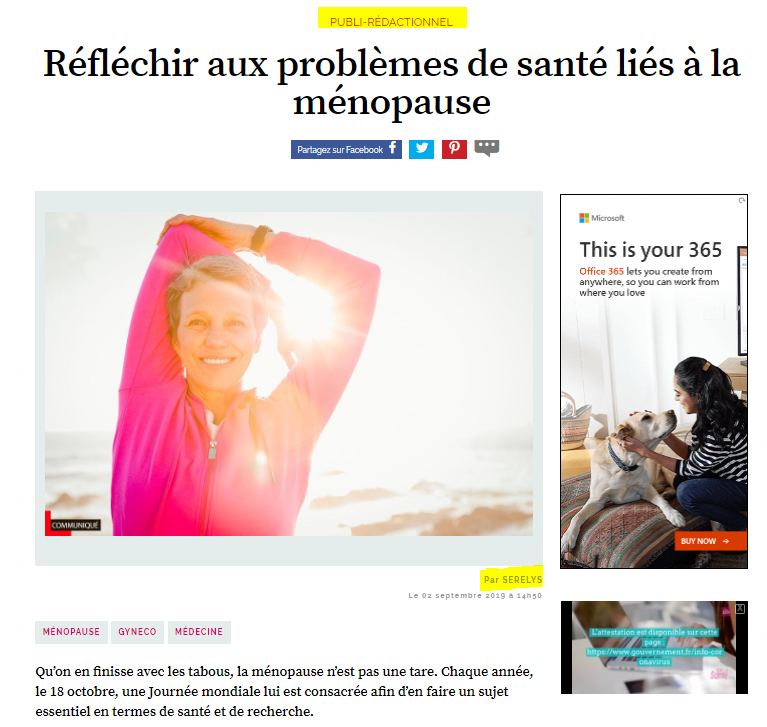 Ci-dessous, un exemple de publicité déguisée en article, identifiable grâce aux avertissements « Publi-redactionnel » et « par Sérélys ».