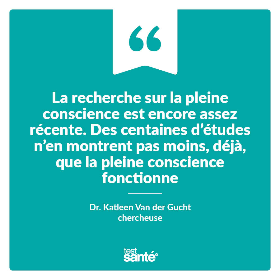 K. Van der Gucht: «La recherche sur la pleine conscience est encore assez récente. Des centaines d’études n’en montrent pas moins, déjà, que la pleine conscience fonctionne. Les preuves les plus solides sont à trouver dans l’utilisation de la pleine conscience dans un contexte clinique. Plusieurs études sérieuses démontrent l’efficacité de la pleine conscience contre les symptômes de la dépression, de l’anxiété et du stress, et pour améliorer la qualité de vie. Les effets sont comparables à ceux d’autres programmes «basés sur des preuves» comme la thérapie cognitivo-comportementale.»