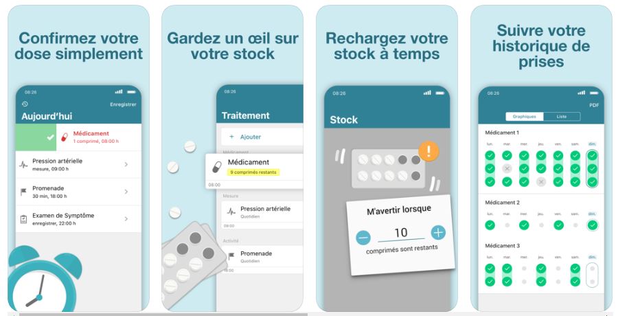 Une application (gratuite) de rappel de prise de médicaments (heure, dosage, fréquence). Possibilité d’ajouter un «MedFriend» (famille, soignants) pour surveiller et encourager l’observance.