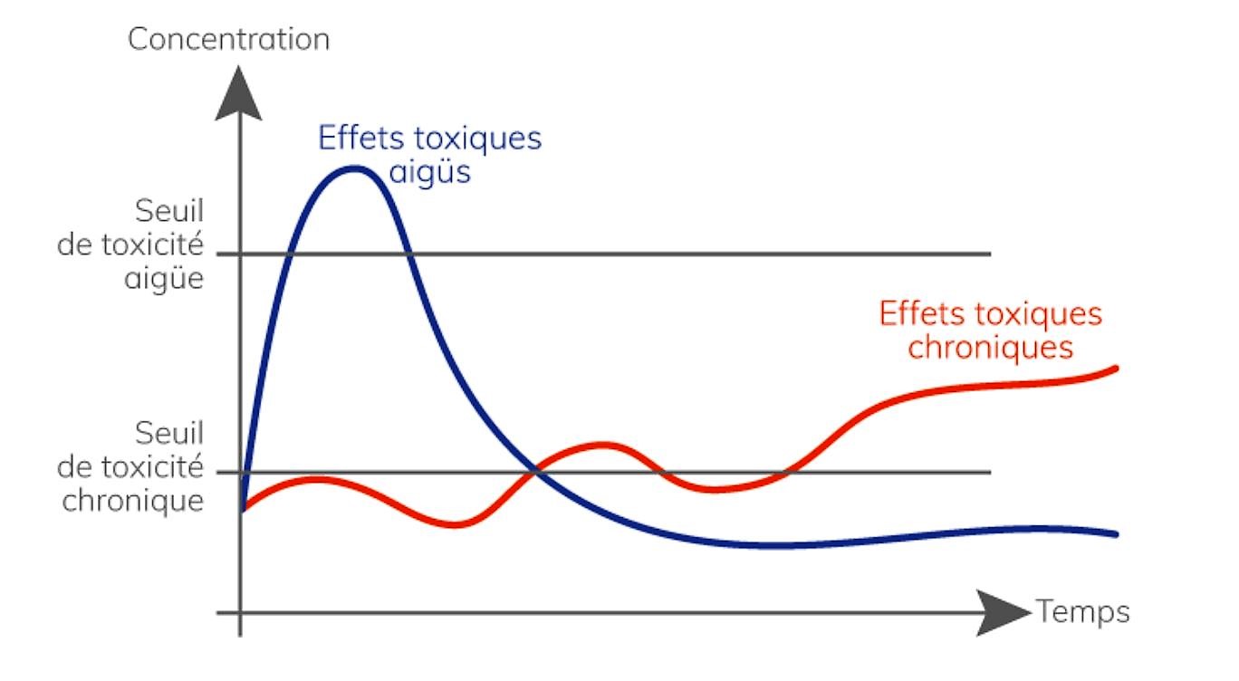 Le risque pour la santé n’est pas immédiat, mais chronique. Cela veut dire que c’est l’exposition dans la durée à ces substances qui peut s’avérer dangereuse Et plus le nombre de substances chimiques auxquelles on est exposé est grand, plus le risque de maladies augmente à cause de l’effet cocktail (voir ci-après). En toxicité chronique, ce n’est pas la dose qui fait le poison, mais la fréquence d’exposition à des polluants toxiques.