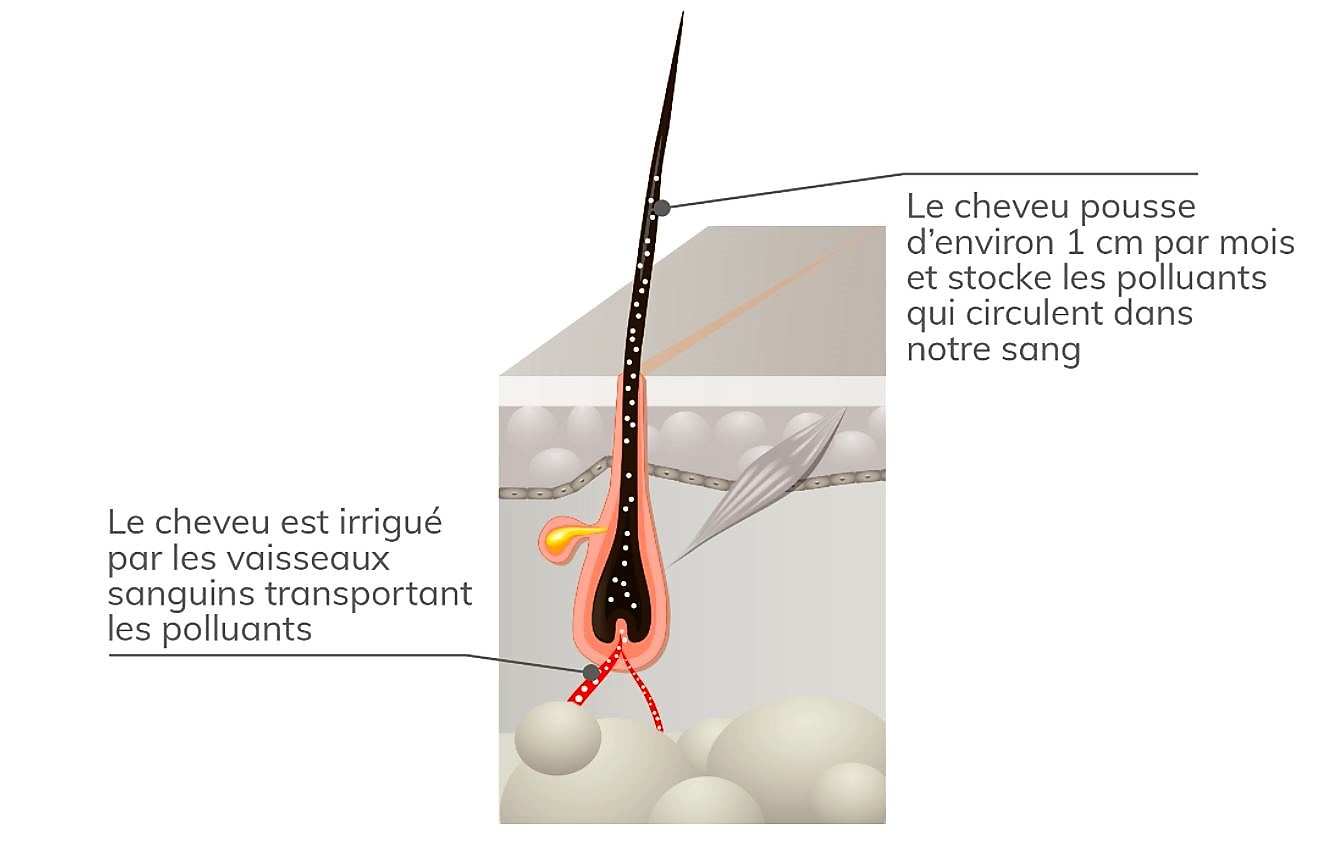 Le cheveu constitue une sorte de « mémoire biologique » permettant d’identifier et de dater une éventuelle exposition à une ou plusieurs substances toxiques. Il constitue la seule matrice adaptée à l’étude d’une longue période d’exposition aux polluants. Pourquoi ? Parce qu'il se sert du sang (il a besoin de ses protéines) pour pousser. Les polluants, absorbés par notre corps, sont transportés par notre sang. Le cheveu se sert du sang pour pousser. Les polluants, circulant dans le sang, sont automatiquement captés par la trame du cheveu lors de sa pousse et sont figés.