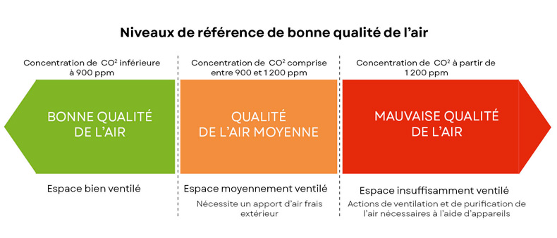 A partir de 1200 ppm, la qualité de l'air dans une pièce est insuffisante et des actions de ventilation efficace et de purification de l’air à l’aide d’appareils doit être entreprises.