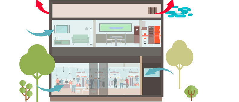 - La ventilation mécanique : Elle nécessite l’installation d’un système de ventilation qui pulse de l’air extérieur à l’intérieur du local ou du bâtiment, et/ou qui, en parallèle, évacue l’air intérieur vers l’extérieur. Un tel système peut être installé soit dans un local spécifique (WC, par exemple), ou bien à l’échelle de tout un bâtiment (système automatiquement contrôlé). Plus la ventilation sera intense et régulière, plus le risque de contamination par les polluants de l’air intérieur sera réduit.