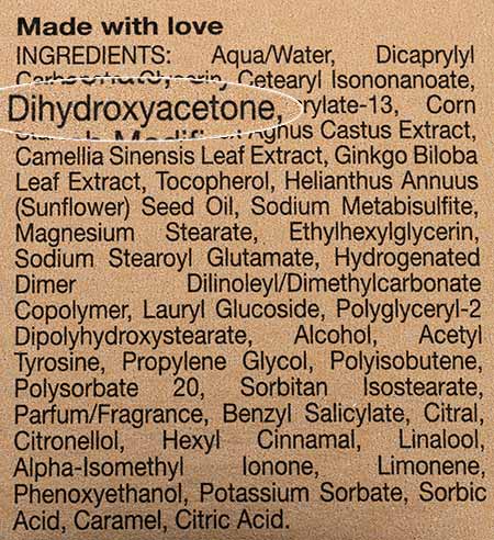 La liste des ingrédients d'un autobronzant mentionne la dihydroxyacétone. Vers le haut de la page