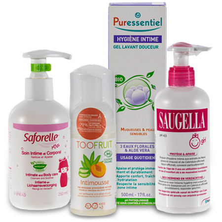 Parmi les produits d’hygiène intime spécialement destinés aux jeunes filles à partir de 2 ou 3 ans, on peut citer Saugella Girl, Saforelle Miss ou TooFruit Intimousse. D’autres se présentent comme des produits pouvant être utilisés aussi bien par les adultes que les enfants à partir de 3 ans, ce qui est le cas du gel lavant douceur Bio Hygiène Intime de Puressentiel.