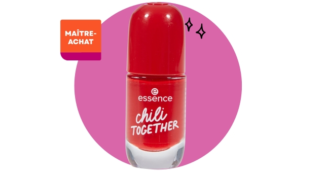 Essence Chili Together se distingue par son excellent rapport qualité-prix et a été élu « Meilleur achat » lors de notre test. En laboratoire, ce vernis à ongles obtient une excellente note (5/5) pour sa résistance aux rayures et aux taches, malgré son prix modique.