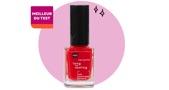 Le vernis à ongles longue tenue 210 Pure de HEMA a également obtenu le label « Meilleur du test ». En laboratoire, ce vernis à ongles a obtenu d'excellents résultats (5/5) en matière de résistance aux rayures et à l'adhérence.