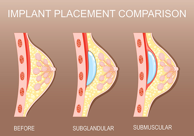 La pose de l’implant devant le muscle pectoral (directement derrière le tissu mammaire) est souvent moins douloureuse qu’une pose derrière ce muscle. Mais chez les patientes ayant peu de tissu mammaire, il peut être préférable de poser la prothèse (partiellement) derrière le muscle pectoral, notamment pour empêcher que l’on voie les bords des implants.