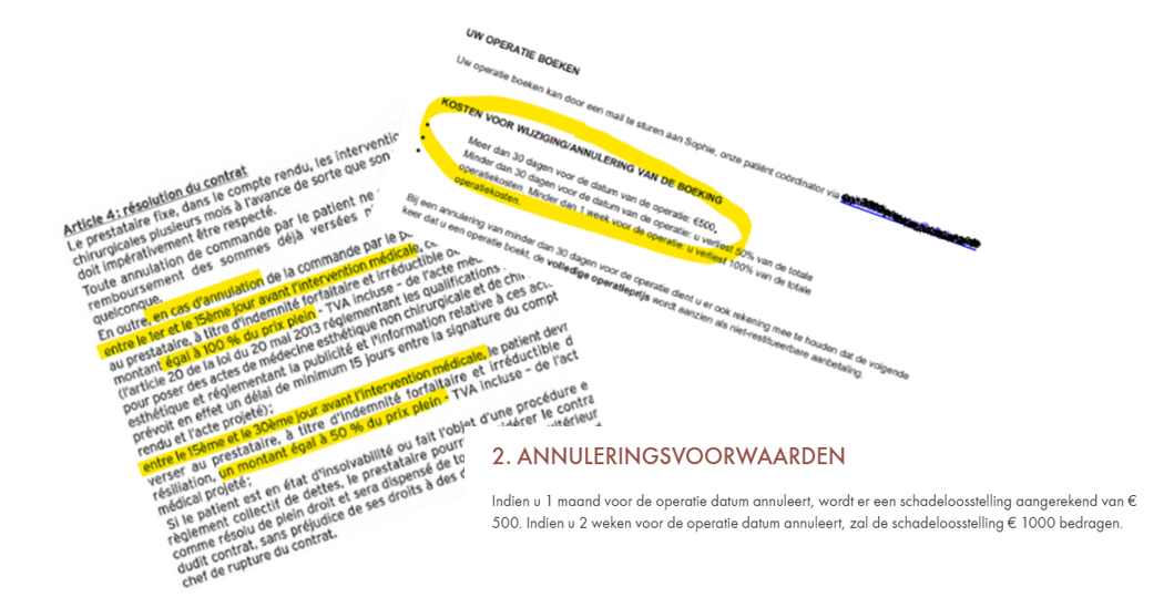 - La Wellness Kliniek (Genk) exige de payer des "frais de réservation" (605 €) dans les 24 heures. Cette somme ne sera jamais remboursée, que l’opération ait lieu ou pas. Le moment de l’annulation n’a pas d’importance.