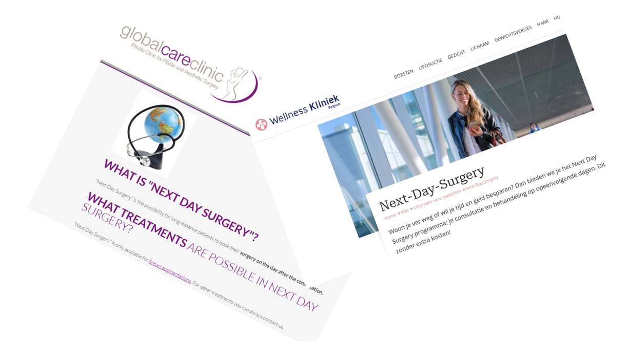 "Next Day Surgery" n'est pas autorisée pour les interventions de chirurgie esthétique en Belgique. Le chirurgien ne peut vous opérer qu'après une période d'attente d'au moins 15 jours.