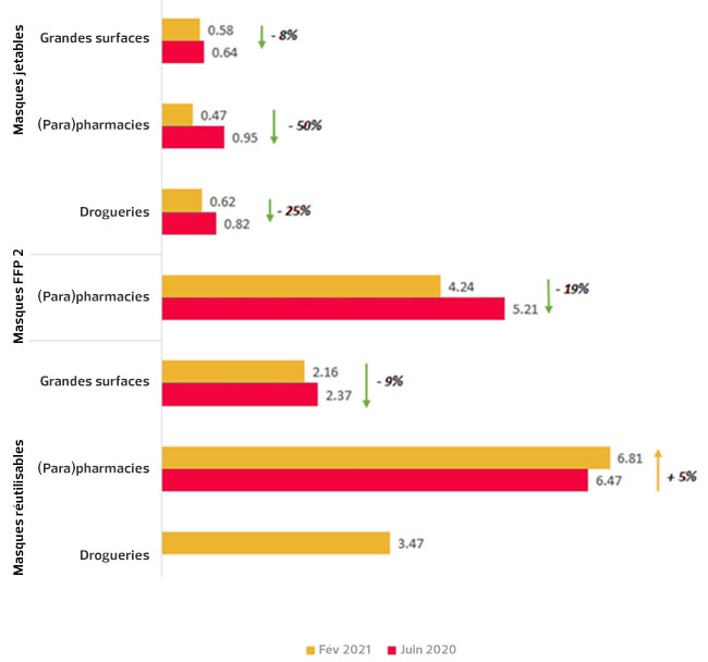 Pour les masques réutilisables, seul le prix des masques pour adultes a été pris en compte dans la comparaison, car pour 2020 nous ne disposions de données de référence que pour ce type de masque.