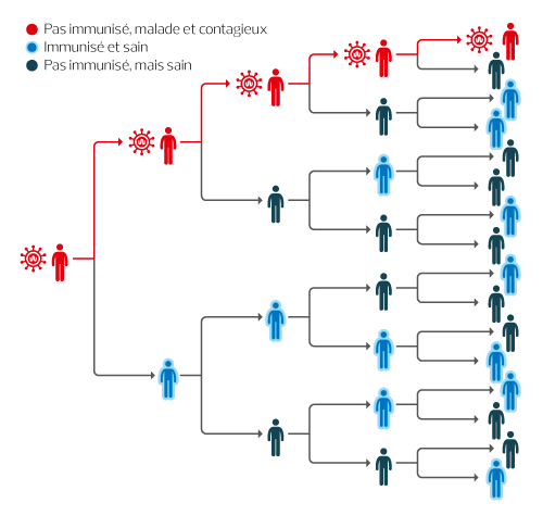 Afin d'obtenir cette immunité de groupe tant discutée, la protection contre les infections est également une condition préalable. Ce n'est qu'alors que vous ne transmettrez plus le virus et que vous vous protégerez non seulement vous-même, mais aussi les autres. L'illustration ci-dessous vous donne une idée de la manière dont cela fonctionne: